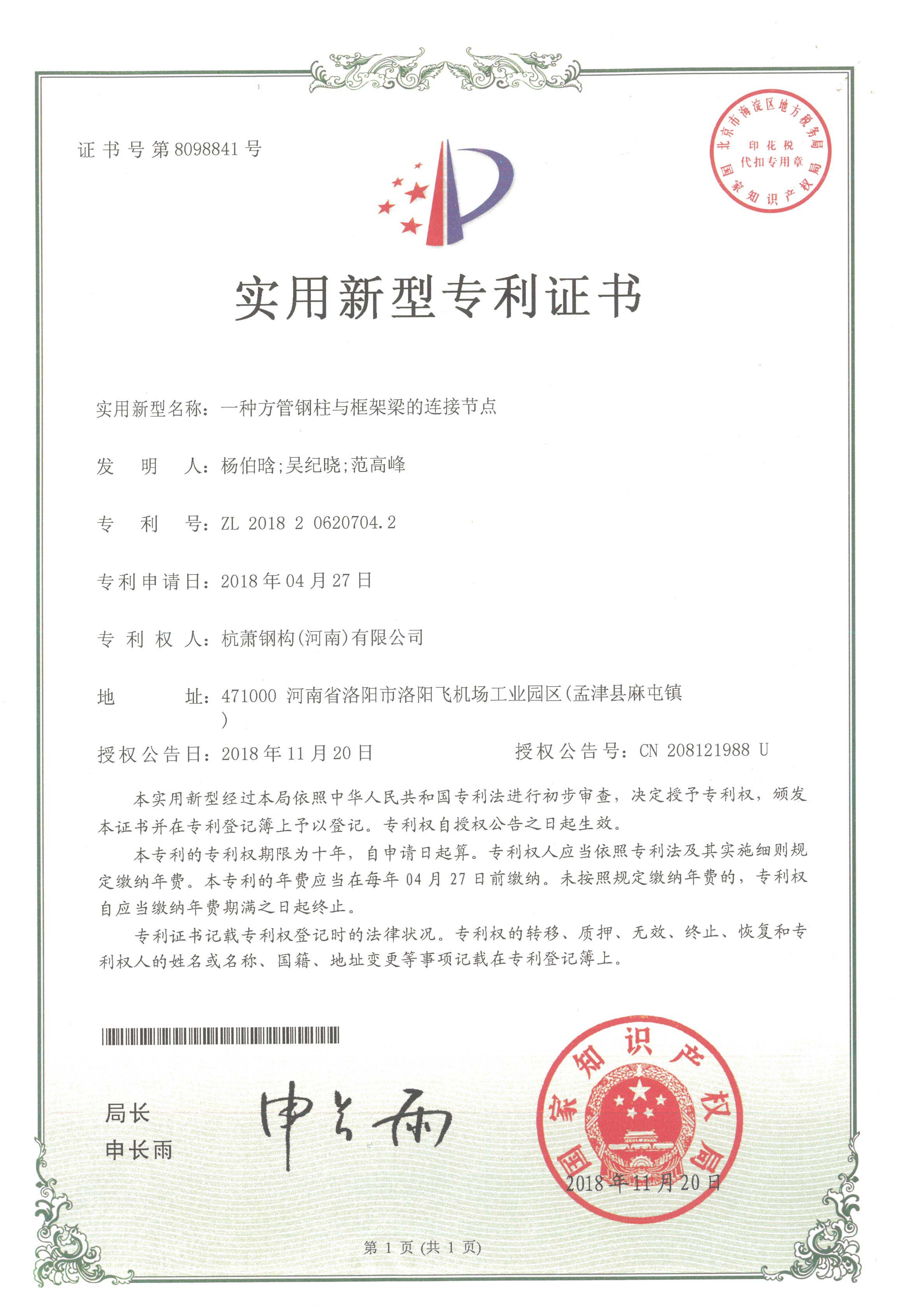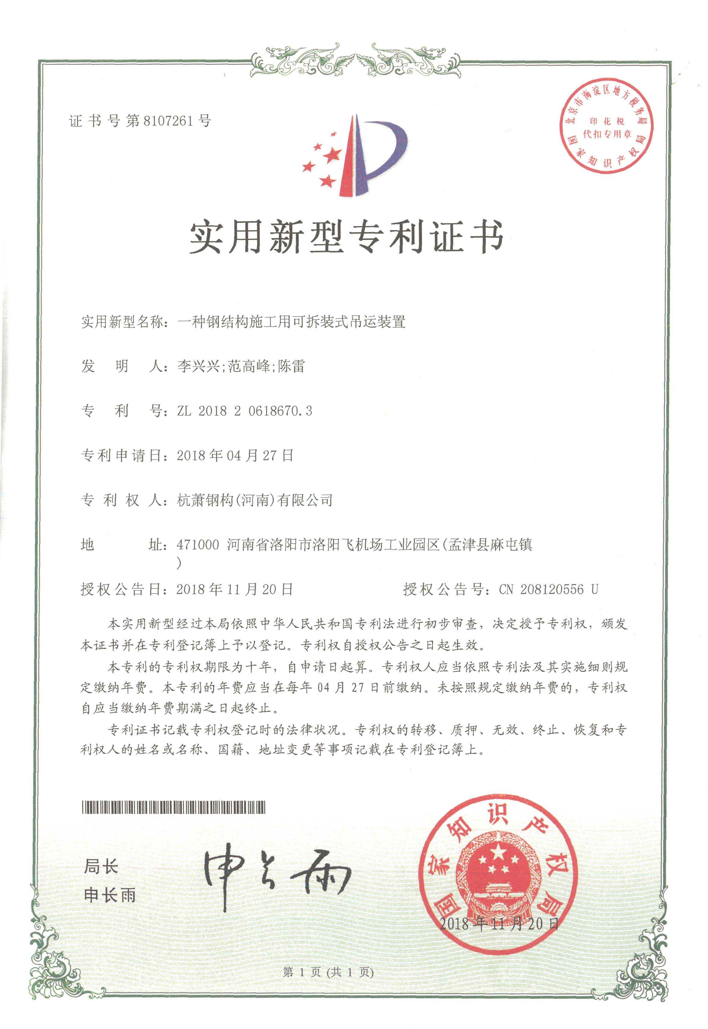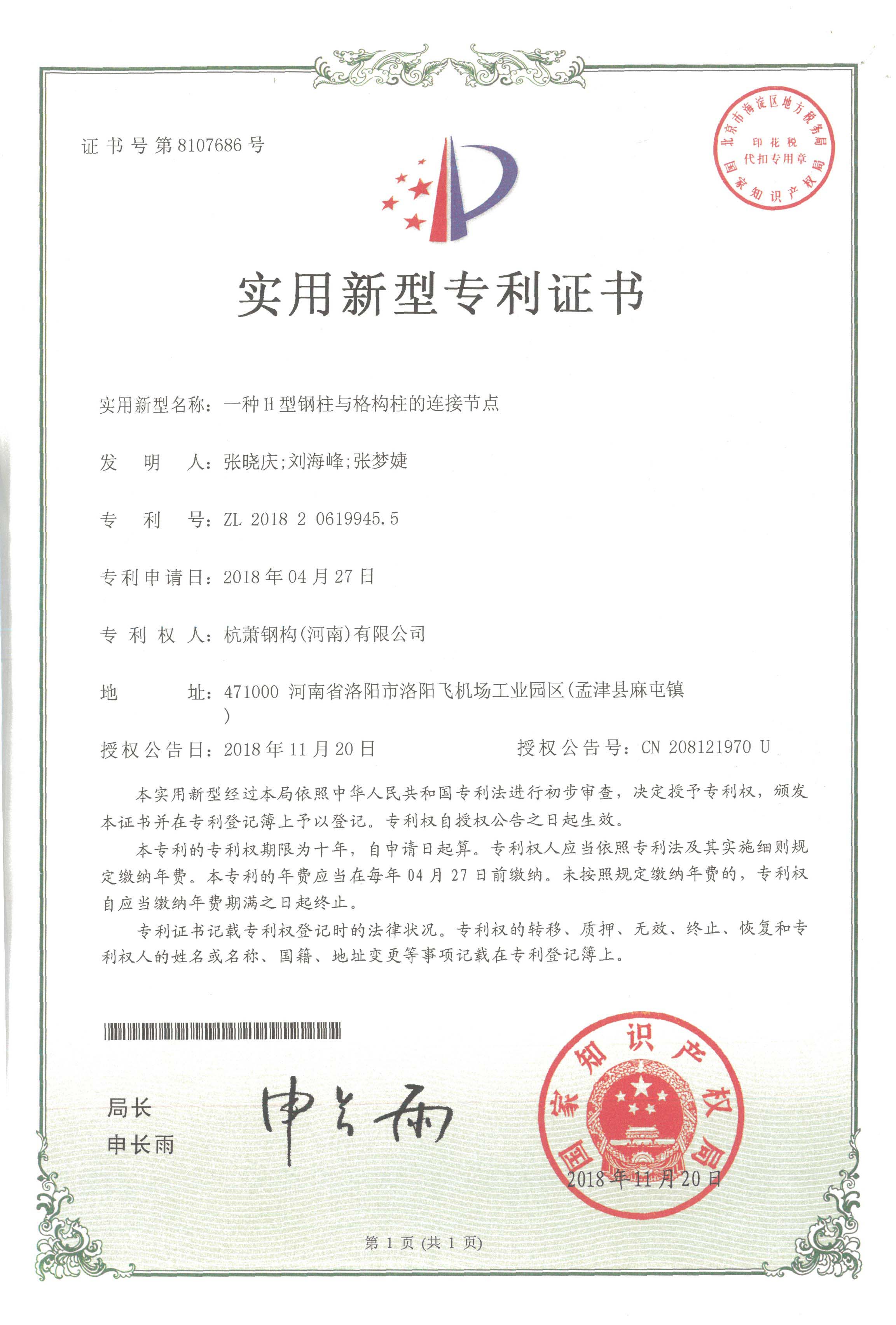 近日,杭蕭鋼構股份有限公司(以下簡稱“杭蕭鋼構”)全資子公司——杭蕭鋼構(河南)有限公司(以下簡稱“河南杭蕭”)申請的“一種鋼結構桁架雨棚”、“一種H型鋼柱與格構柱的連接節(jié)點”、“一種方管鋼柱與框架梁的連接節(jié)點”及“一種鋼結構施工用可拆裝式吊運裝置”共四項實用新型專利,經(jīng)中華人民共和國國家知識產(chǎn)權局專利審查局嚴格審查,獲得授權證書。