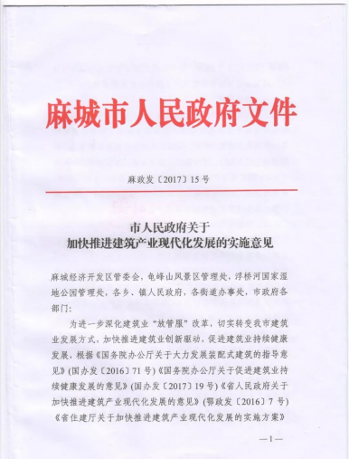 推進(jìn)建筑產(chǎn)業(yè)現(xiàn)代化,大力發(fā)展鋼結(jié)構(gòu)和裝配式建筑,是黨中央、國務(wù)院作出的重大決策,麻城市政府根據(jù)國務(wù)院和相關(guān)部委、湖北省政府的產(chǎn)業(yè)政策,于2017年9月出臺了《關(guān)于加快推進(jìn)建筑產(chǎn)業(yè)現(xiàn)代化的實(shí)施意見》的文件,對于麻城市建筑產(chǎn)業(yè)結(jié)構(gòu)升級、建筑產(chǎn)業(yè)現(xiàn)代化的發(fā)展作出了明確部署和要求,確定以城區(qū)為龍頭,以政府投資項(xiàng)目為重點(diǎn),以裝配式建筑技術(shù)作為主要實(shí)現(xiàn)形式,支持企業(yè)投資建設(shè)建筑產(chǎn)業(yè)現(xiàn)代化基地,開展建筑產(chǎn)業(yè)現(xiàn)代化項(xiàng)目應(yīng)用試點(diǎn)。