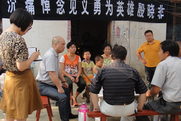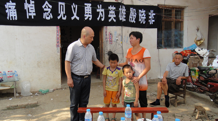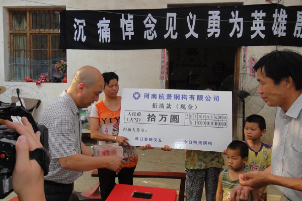 6月10日下午,為了解決英雄家屬精神、生活等方面的難題,河南杭蕭鋼構(gòu)有限公司總經(jīng)理孫偉從洛陽(yáng)來(lái)到英雄殷曉非的家看望慰問(wèn)英雄家屬并帶去了10萬(wàn)元的慰問(wèn)金,孫總還承諾,這10萬(wàn)元只是暫時(shí)解決家里的燃眉之急,以后還會(huì)解決三個(gè)孩子上學(xué)問(wèn)題和就業(yè)問(wèn)題。隨后,孫總給殷曉非的妻子留下聯(lián)系方式,說(shuō)以后有什么情況都可以聯(lián)系他。