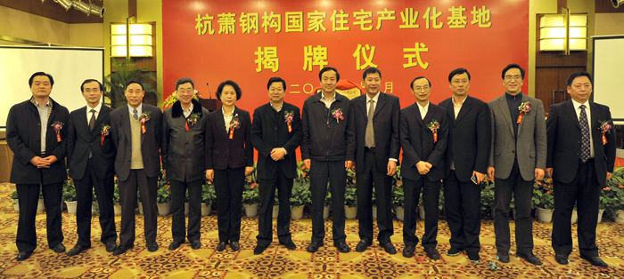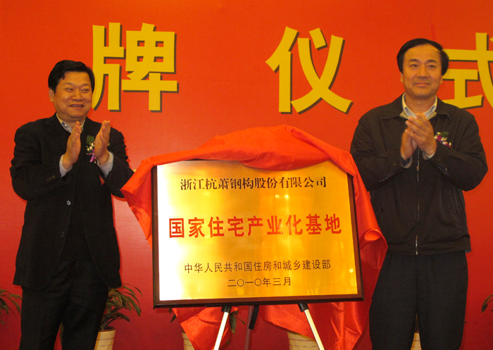????2010年12月7日,"杭蕭鋼構(gòu)國家住宅產(chǎn)業(yè)化基地"在杭蕭鋼構(gòu)舉行揭牌儀式。住建部副部長齊驥、住建部住宅產(chǎn)業(yè)化促進中心主任劉燦、住建部住宅產(chǎn)業(yè)化促進中心副主任梁小青、浙江省副省長陳加元、浙江省建設(shè)廳廳長談月明、浙江省建設(shè)廳副廳長賈寶林、杭州市建委主任楊軍、杭州市建委副主任徐紅、蕭山區(qū)副區(qū)長朱云夫等領(lǐng)導出席揭牌儀式,住建部副部長齊驥和省建設(shè)廳廳長談月明為"杭蕭鋼構(gòu)國家住宅產(chǎn)業(yè)化基地"揭牌。