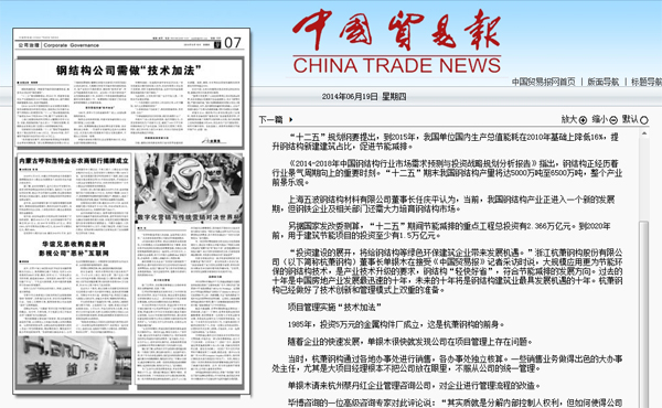 2014年6月19日,《中國(guó)貿(mào)易報(bào)》第七版《公司治理》報(bào)道:《鋼結(jié)構(gòu)公司需做“技術(shù)加法”》。