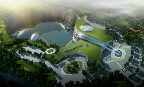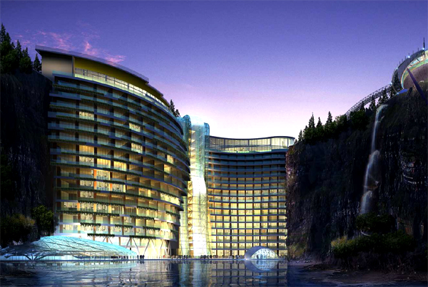 上海世茂新體驗項目深坑酒店位于上海松江區(qū)佘山國家旅游度假村,酒店地上三層、地下17層、水下一層,并設(shè)有蹦極等娛樂項目。整個項目投資6億元左右,含天然室內(nèi)花園、大型景觀瀑布、景觀總統(tǒng)房、水中情景房等。酒店海拔負65米,有望成為世界上人工坑內(nèi)海拔最低的酒店。