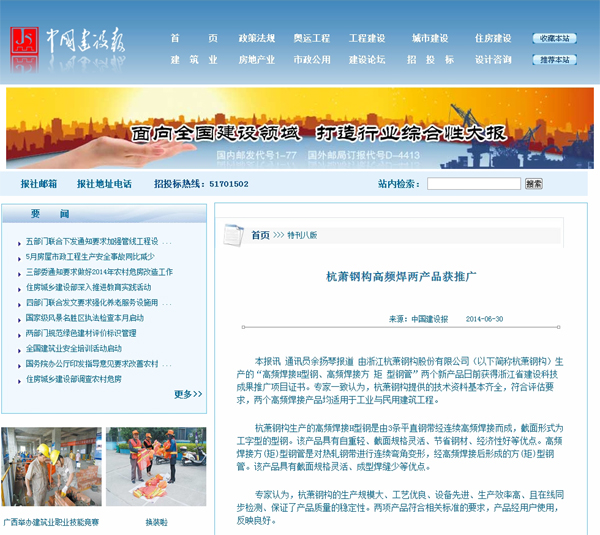 2014年6月30日,《中國建設(shè)報(bào)》第8版《鋼結(jié)構(gòu)》報(bào)道:《杭蕭鋼構(gòu)高頻焊兩產(chǎn)品獲推廣》。