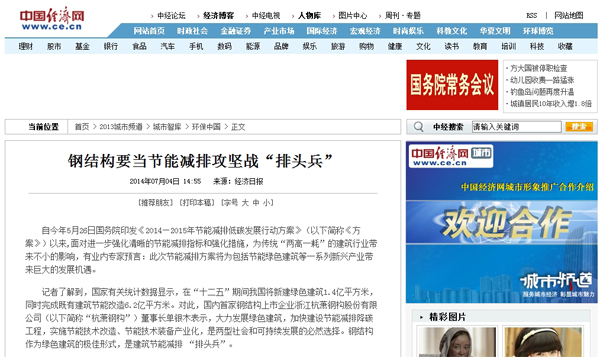2014年7月4日,《中國經(jīng)濟(jì)網(wǎng)》報道:《鋼結(jié)構(gòu)要當(dāng)節(jié)能減排攻堅戰(zhàn)“排頭兵”》。