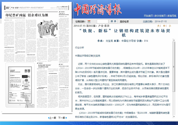 2014年7月15日,《中國(guó)經(jīng)濟(jì)導(dǎo)報(bào)》第B02版《產(chǎn)業(yè)·投資》報(bào)道:《“鐵規(guī)、新標(biāo)”讓鋼結(jié)構(gòu)建筑迎來(lái)市場(chǎng)契機(jī)》。