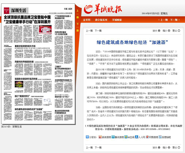 2014年7月25日,《羊城晚報》A24版《深圳生活》報道:《綠色建筑成各地循環(huán)經(jīng)濟加速器》。
