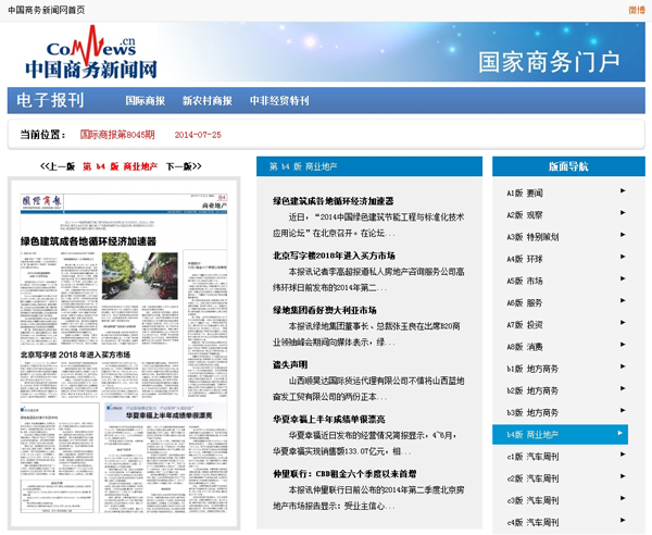 2014年7月24日,《國際商報》B4版《商業(yè)地產(chǎn)》報道:《綠色建筑成各地循環(huán)經(jīng)濟加速器》。