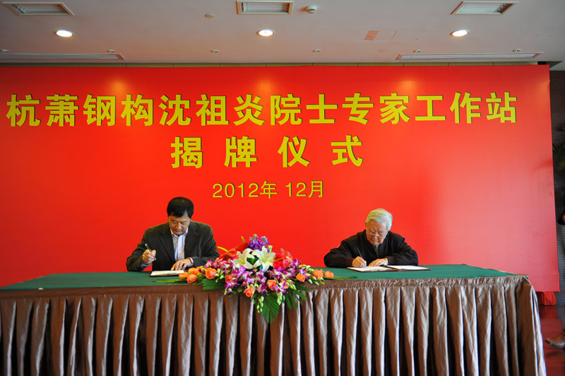 ????杭蕭鋼構(gòu)董事長(zhǎng)單銀木、總經(jīng)理陸擁軍、總工程師陳友泉、杭州杭蕭設(shè)計(jì)有限公司總經(jīng)理?xiàng)顝?qiáng)躍,中國(guó)工程院士沈祖炎、同濟(jì)大學(xué)科技處副處長(zhǎng)李光明、杭州市科協(xié)院士專家服務(wù)中心主任吳挺、蕭山區(qū)科學(xué)技術(shù)協(xié)會(huì)副主席俞校明等出席儀式。