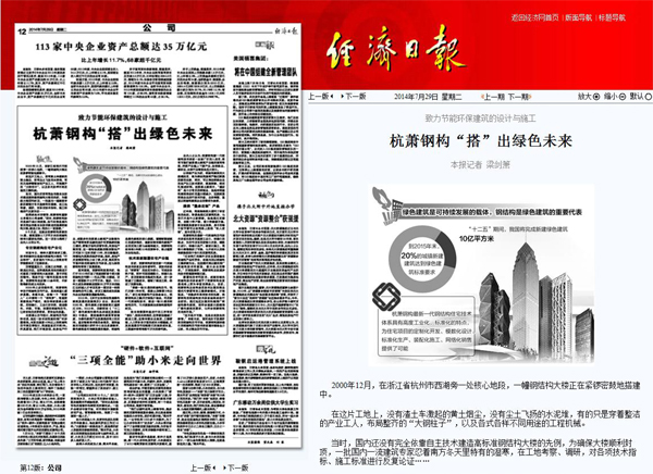 2014年7月29日,《經(jīng)濟(jì)日?qǐng)?bào)》第12版《公司》報(bào)道:《杭蕭鋼構(gòu)“搭”出綠色未來(lái)》。