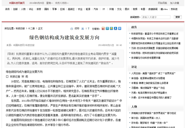 2014年8月21日,《科技日?qǐng)?bào)》第十二版《綠色家園》報(bào)道:《綠色鋼結(jié)構(gòu)成為建筑業(yè)發(fā)展方向》。