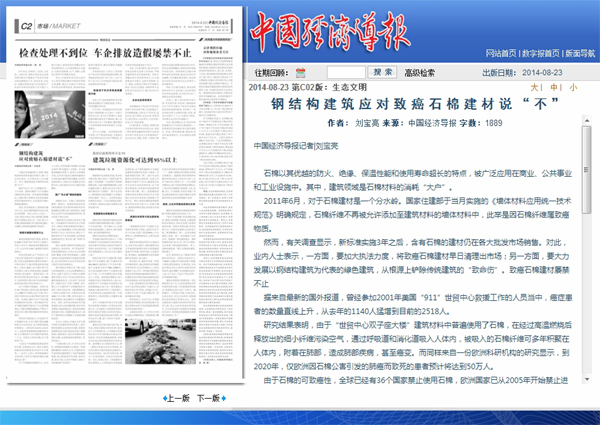 2014年8月23日,《中國經(jīng)濟導報》第C02版《生態(tài)文明》報道:《鋼結構建筑應對致癌石棉建材說“不”》。