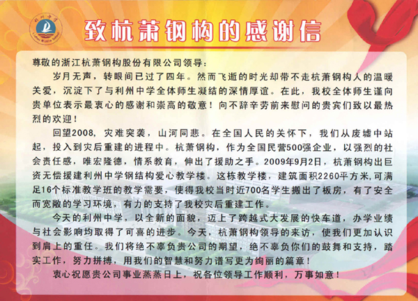 ??? 杭蕭鋼構(gòu)回訪團(tuán)一行結(jié)束回訪時已近傍晚6點,在回成都的路上,回訪人員手捧著的利州中學(xué)感謝信消退了此行的疲憊。這是學(xué)校一名老師得知杭蕭鋼構(gòu)一行來訪后有感而發(fā),寫下的一封情真意切的感謝信——飛逝的時光帶不走杭蕭鋼構(gòu)人的溫暖關(guān)愛,沉淀下了與利州中學(xué)全體師生凝結(jié)的深情厚誼?!际掍摌?gòu)出巨資無償援建的利州中學(xué)鋼結(jié)構(gòu)愛心教學(xué)樓使得我校當(dāng)時近700名學(xué)生搬出了樣板房,有了安全而寬敞的學(xué)習(xí)環(huán)境,有力的支持了我校災(zāi)后重建工作?!覀儗⒔^不辜負(fù)貴公司的期望,絕不辜負(fù)你們的鼓舞和支持,踏實工作,努力拼搏,用我們的智慧和努力譜寫更為絢麗的篇章。