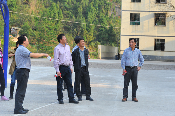 朝天區(qū)教育和科學(xué)技術(shù)局副局長李定本(左一)及沙河鎮(zhèn)小學(xué)校長杜彥章(左三)陪同杭蕭鋼構(gòu)董事長單銀木(左二)一行巡視和考察捐建教學(xué)樓