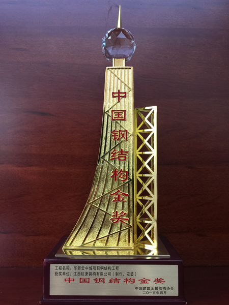 鋼結(jié)構(gòu)金獎(jiǎng)一直是江西杭蕭的空缺,中國建筑金屬結(jié)構(gòu)協(xié)會(huì)于2014年5月6日下發(fā)了關(guān)于2014年的鋼結(jié)構(gòu)金獎(jiǎng)申報(bào)工作的通知,公司立即抓住這次機(jī)會(huì),并根據(jù)通知要求成立申報(bào)責(zé)任小組,分工協(xié)作。從2014年7月30日開始,經(jīng)過各項(xiàng)核查,包括施工單位匯報(bào)、各相關(guān)單位匯報(bào)、技術(shù)疑點(diǎn)難點(diǎn)交流、資料檢查、查看施工現(xiàn)場等,終于,江西杭蕭“華新云中城項(xiàng)目”榮獲第十一屆(2013~2014年度)第二批中國鋼結(jié)構(gòu)金獎(jiǎng)。