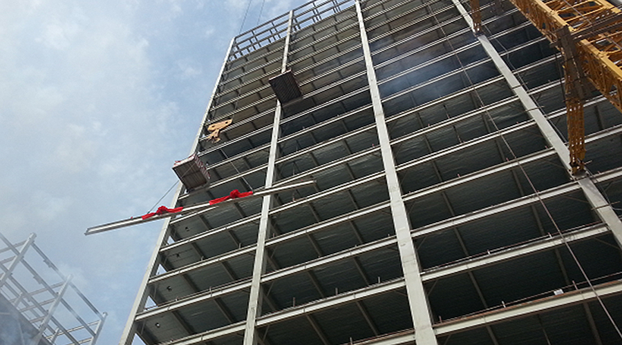 河北杭蕭承擔(dān)銀川寧港財(cái)富中心2-3#樓、2-4#樓兩棟樓的鋼結(jié)構(gòu)工程,兩棟樓全部采用鋼框架支撐結(jié)構(gòu)。其中2-3#樓總高度97.9米,主體結(jié)構(gòu)為27層,總建筑面積3.7萬平方米,鋼結(jié)構(gòu)總重3124噸;2-4#樓建筑總高度為89.5米,主體結(jié)構(gòu)為23層,總建筑面積為2.56萬平方米,鋼結(jié)構(gòu)總重2385噸。?