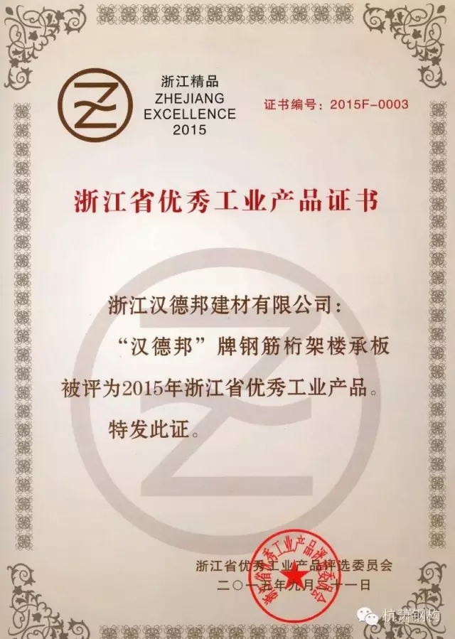漢德邦鋼筋桁架樓承板獲評(píng)“浙江省優(yōu)秀工業(yè)產(chǎn)品”