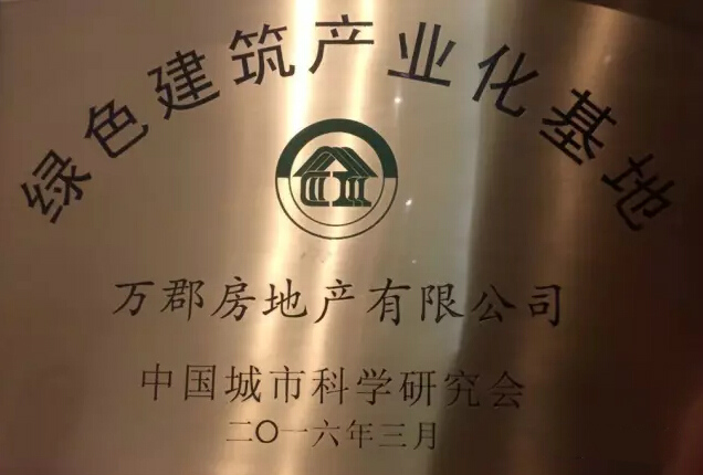 2016年3月30日,第十二屆“國際綠色建筑與建筑節(jié)能大會暨新技術(shù)與產(chǎn)品博覽會”開幕式大會在北京國家會議中心召開,萬郡房地產(chǎn)有限公司作為綠色建筑產(chǎn)業(yè)化基地代表出席,并成為全國首家獲得“綠色建筑產(chǎn)業(yè)化基地”獎項的房地產(chǎn)企業(yè)。