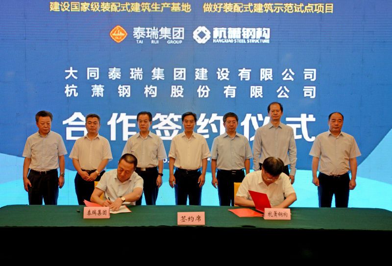 7月20日,杭蕭鋼構(gòu)股份有限公司(以下簡(jiǎn)稱“杭蕭鋼構(gòu)”)與大同泰瑞集團(tuán)建設(shè)有限公司(以下簡(jiǎn)稱“泰瑞集團(tuán)”)共同打造“大同裝配式綠色建筑集成產(chǎn)業(yè)基地”簽約儀式在太原舉行,這標(biāo)志著山西省首家裝配式鋼結(jié)構(gòu)產(chǎn)業(yè)基地正式落戶大同。山西省委常委、常務(wù)副省長(zhǎng)高建民,山西省住建廳廳長(zhǎng)李棟梁,大同市委書記張吉福、市長(zhǎng)馬彥平,省住建廳總工程師張學(xué)峰,大同市副市長(zhǎng)劉振國(guó)等領(lǐng)導(dǎo)及杭蕭鋼構(gòu)集團(tuán)總裁張振勇、泰瑞集團(tuán)總經(jīng)理張明忠等60余人見(jiàn)證了泰瑞集團(tuán)與杭蕭鋼構(gòu)戰(zhàn)略合作簽約。