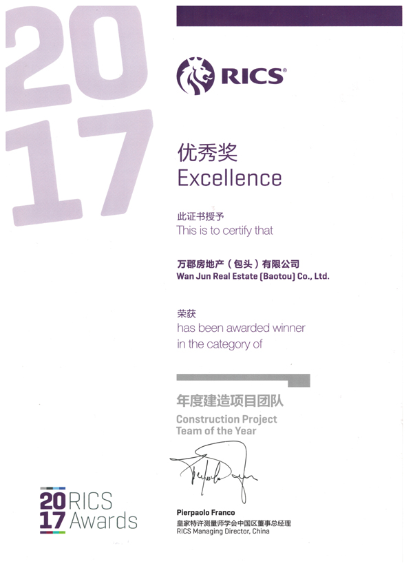近日,RICS華東年度晚宴暨“RICS Awards,中國2017”頒獎典禮在上海隆重舉行,活動匯集了眾多房地產(chǎn)、建筑、造價等領(lǐng)域的知名專家。萬郡房地產(chǎn)(包頭)有限公司參與評審的“年度建造項(xiàng)目團(tuán)隊(duì)”喜獲優(yōu)秀獎, RICS中國理事會主席梁士毅先生為我司頒獎。另外我司還獲得了“年度研究團(tuán)隊(duì)”的入圍獎。