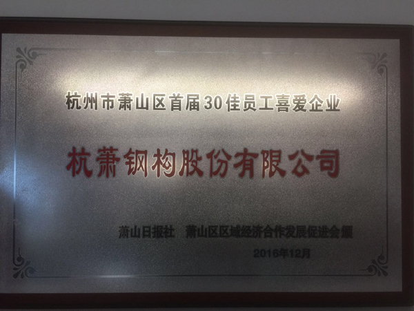 蕭山日?qǐng)?bào)社、蕭山區(qū)域經(jīng)濟(jì)促進(jìn)會(huì)組織舉辦了 “蕭山首屆30佳員工喜愛企業(yè)”評(píng)選活動(dòng)。2017年2月28日,該評(píng)選活動(dòng)表彰會(huì)在蕭山湘湖驛站圓滿落幕。杭蕭鋼構(gòu)喜獲“蕭山首屆30佳員工喜愛企業(yè)”榮譽(yù)稱號(hào)。