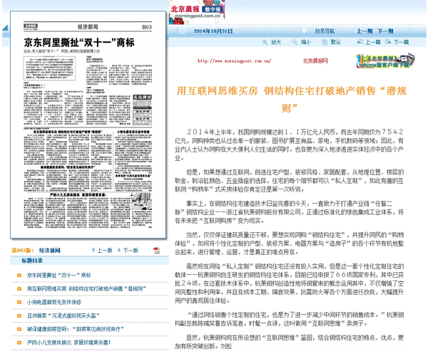2014年10月31日,《北京晨報(bào)》第B03版《經(jīng)濟(jì)新聞》報(bào)道:《用互聯(lián)網(wǎng)思維買房 鋼結(jié)構(gòu)住宅打破地產(chǎn)銷售“潛規(guī)則”》。