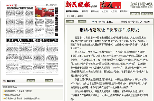 2014年10月29日,《新民晚報》第6版報道:《鋼結(jié)構(gòu)建筑讓“快餐房”成歷史》